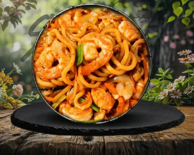 11.9 €Nouilles sautées au wok, crevette pané, légumes frais, chou rouge et sauce katsu